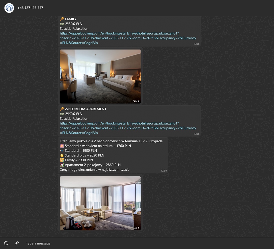 Użytkownicy w trakcie rozmowy mogą otrzymać listę dostępnych ofert i przejść do rezerwacji.