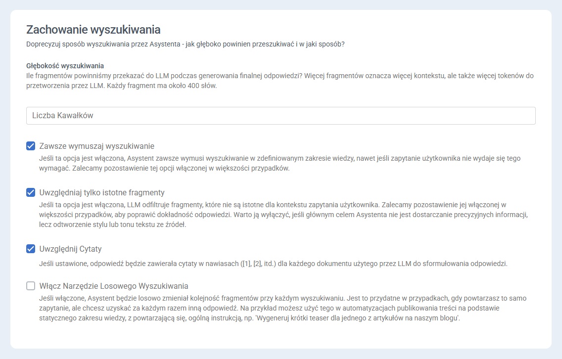 Ta opcja pozwala urozmaicić wybór fragmentów analizowanych przez asystenta, dodając do odpowiedzi mniej oczywiste konteksty. Może być przydatna w sytuacjach, gdy potrzebne są bardziej różnorodne wyniki lub inspiracje.