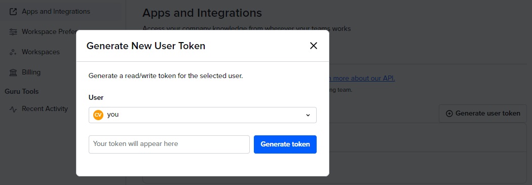 To connect CogniVis AI with Guru, you need to generate a Personal Access Token in Guru. This token will be used to authenticate the connection between CogniVis AI and Guru. See the detailed instructions in the Guru Personal Access Tokens guide.