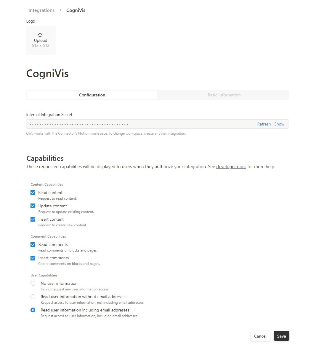 After creating the integration, you'll need to provide it with access to Notion pages and databases. For security reasons, integrations do not automatically have access to any pages or databases in the workspace. You'll need to share the desired pages with the integration for CogniVis to access them.