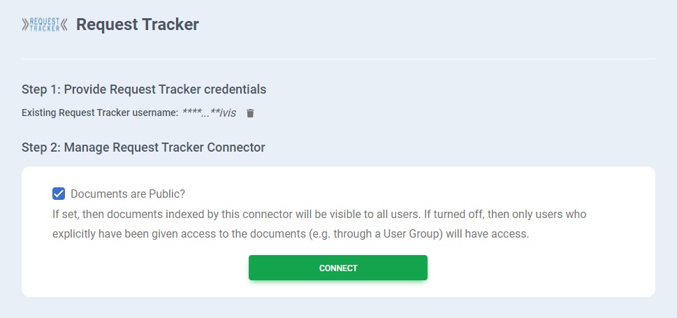 In CogniVis, go to Admin Panel, then in the sidebar choose Add connector. You will find the Request Tracker connector setup page there.
