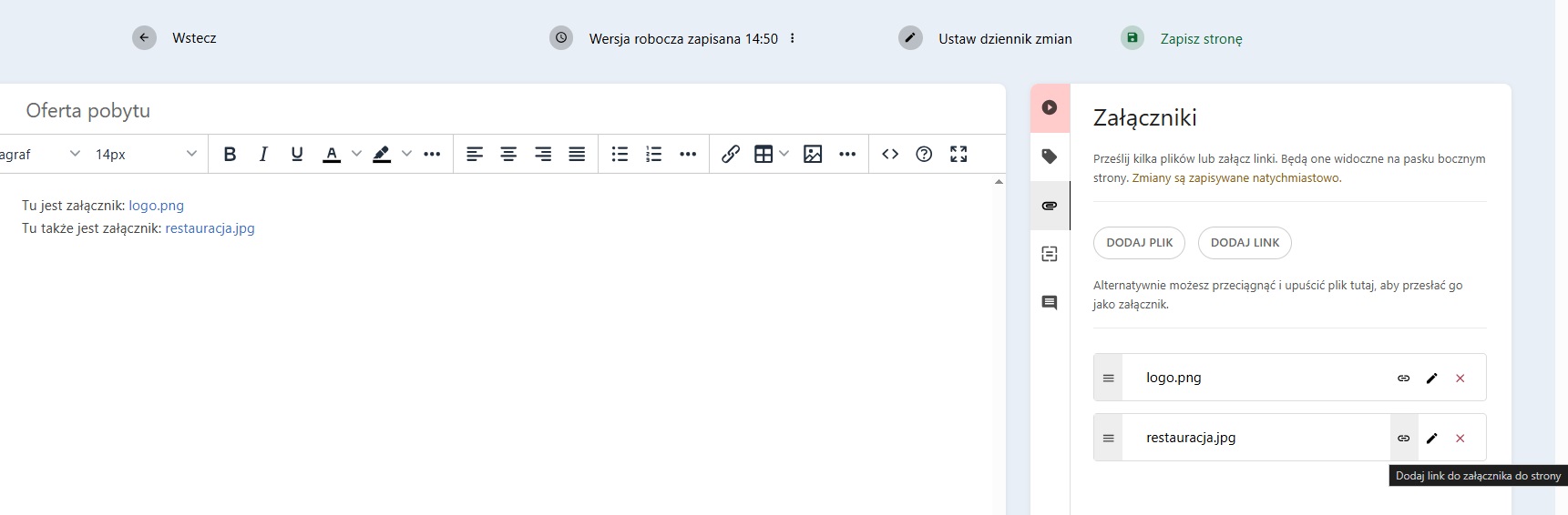 Pierwsza metoda polega na użyciu przycisku z ikoną „linku” przy załączniku w pasku bocznym. Kliknięcie tego przycisku wstawi odnośnik do strony w miejscu, gdzie znajduje się kursor, z poprawnym URL i nazwą załącznika.