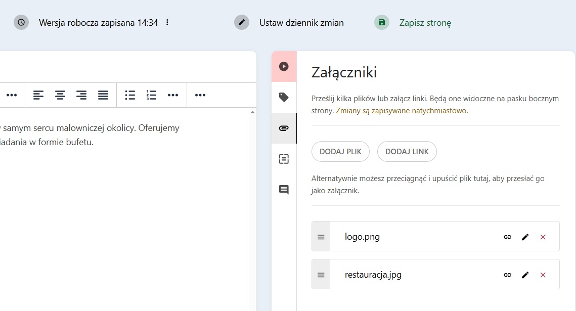 Załączniki można dodawać za pomocą paska bocznego w edytorze strony. Sekcja załączników jest oznaczona ikoną spinacza i po jej otwarciu wygląda następująco: