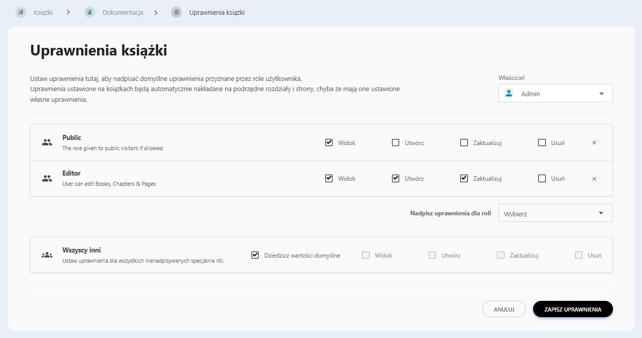 Uprawnienia mogą być zmieniane indywidualnie dla półek, książek, rozdziałów lub stron, jeśli zajdzie taka potrzeba. Można to zrobić, wybierając akcję „Uprawnienia” podczas przeglądania danej zawartości, pod warunkiem że użytkownik ma prawo roli „Zarządzaj wszystkimi/własnymi uprawnieniami”.