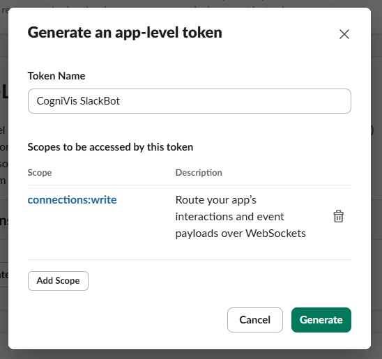Attach the connections:write scope to the app-level token, click Generate, and copy the token to a secure location for later use with Slack Web Sockets.