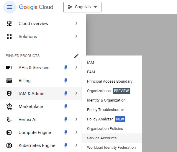 Expand the sidenav, then go to IAM & Admin and choose Service Accounts.