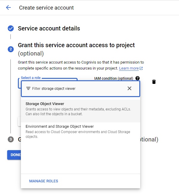 Choose the Storage Object Viewer role or another suitable role with the required permissions, click CONTINUE and then DONE to complete the creation of the service account.