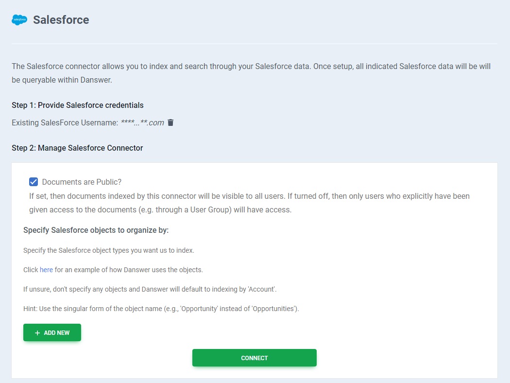 After specifying the object types and deciding whether the documents should be public or not, press the connect button.