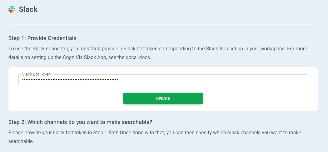 Add the previously copied Slack Bot Token and press the update button.