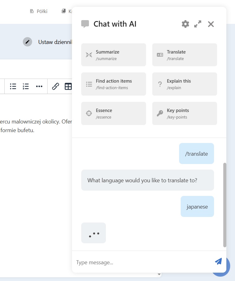 Podczas tworzenia nowej strony w dokumentacji możesz skorzystać z wbudowanego chatu AI. Narzędzie to ułatwia pracę z treściami, oferując gotowe polecenia, które można wywołać jednym kliknięciem.