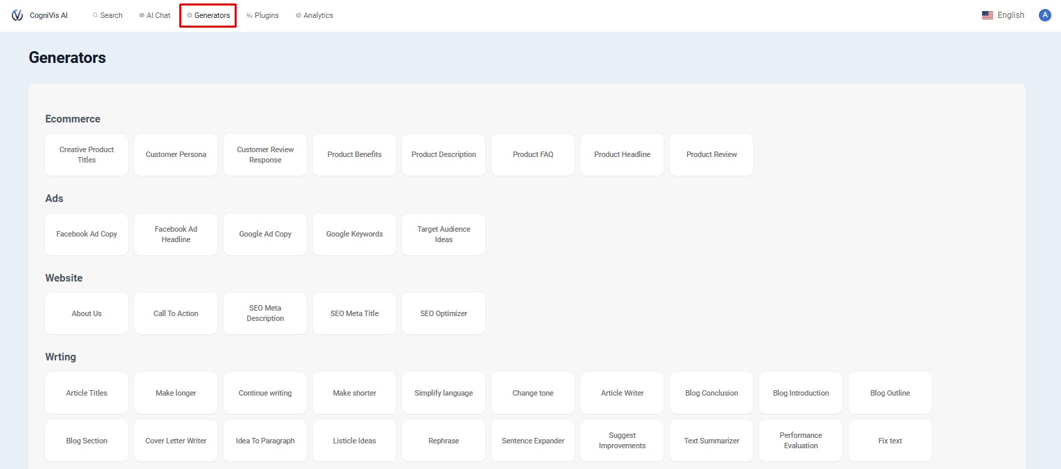 CogniVis comes with premade generators to help you quickly create specific types of content for different needs—such as product descriptions, ad copy, blog sections, and customer responses.