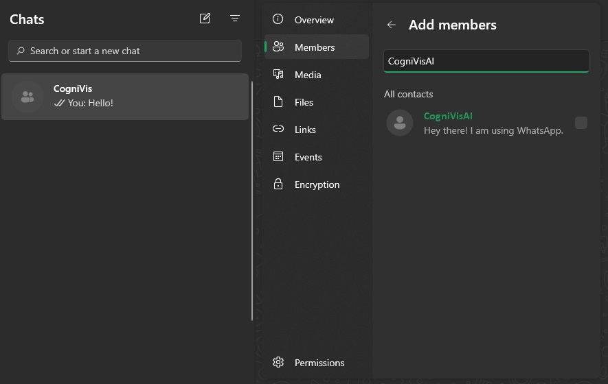 After receiving the bot's phone number from us, add it to your contacts. In the WhatsApp app, go to the group you want to add the WhatsApp Bot to. In the top bar, expand the group settings, go to "Members," select "Add Members," and add the contact with the number you received from us.