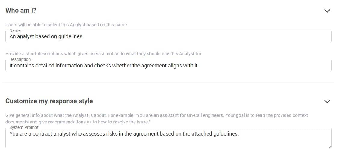 "Document Analyst", as the name suggests, enables the analysis of documents. For example, you can send it a contract for analysis, and it will find all potentially risky elements that you should pay attention to.