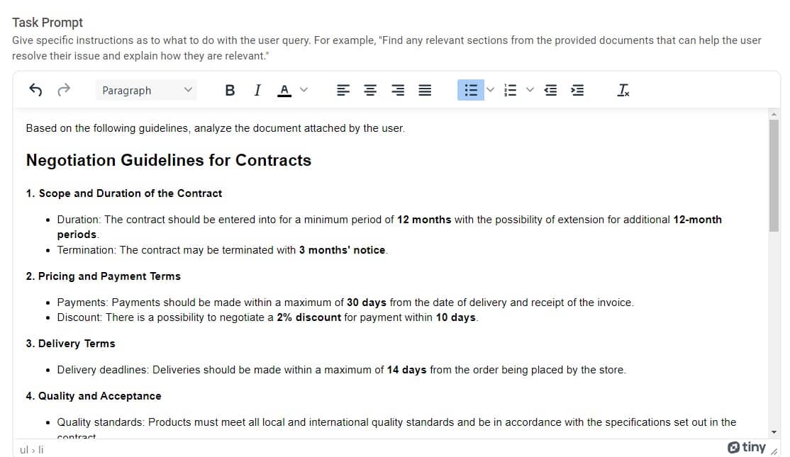 We can continue the conversation with it and, for example, instruct it to list the parts of the contract that are inconsistent with the guidelines.