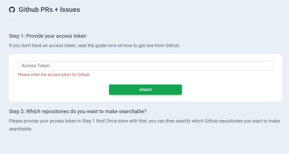 Specify the repositories you want to Index by inputing the owner and repository names.