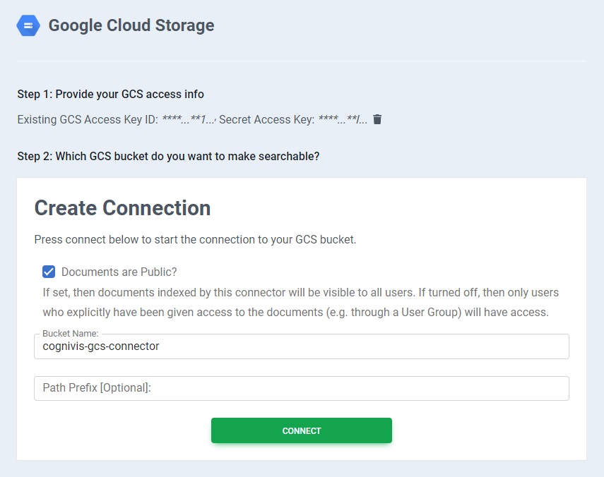 Indicate the GCS bucket you wish to make searchable, specify whether the connector should be public or not, and finally press the CONNECT button.