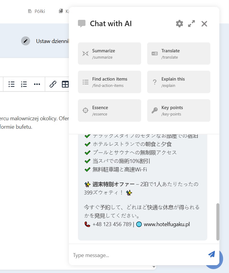 Podczas tworzenia nowej strony w dokumentacji możesz skorzystać z wbudowanego chatu AI. Narzędzie to ułatwia pracę z treściami, oferując gotowe polecenia, które można wywołać jednym kliknięciem.