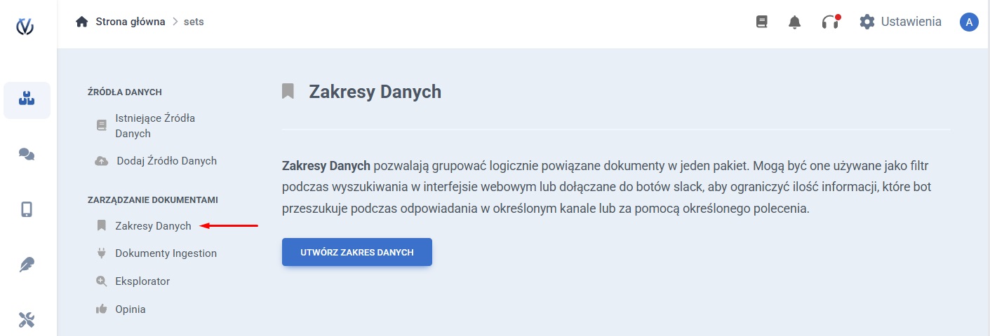 Document sets allow grouping logically related documents into one package. They can then be used as filters during web interface searches or attached to Slack bots to limit the scope of information the bot searches for answers in a specific channel or using a specific command.