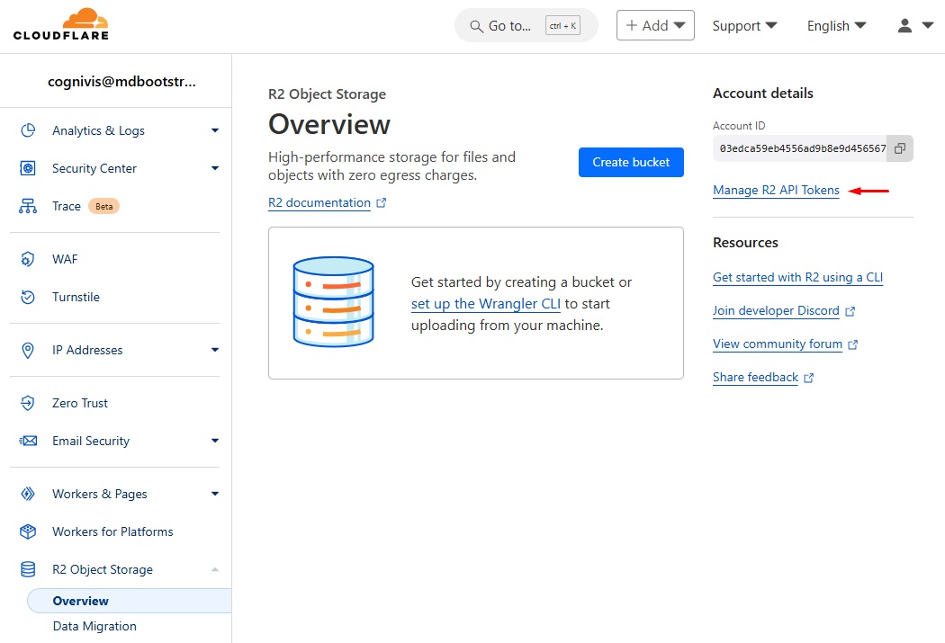 In the sidenav, select R2 Object Storage, then go to Manage R2 API Tokens.