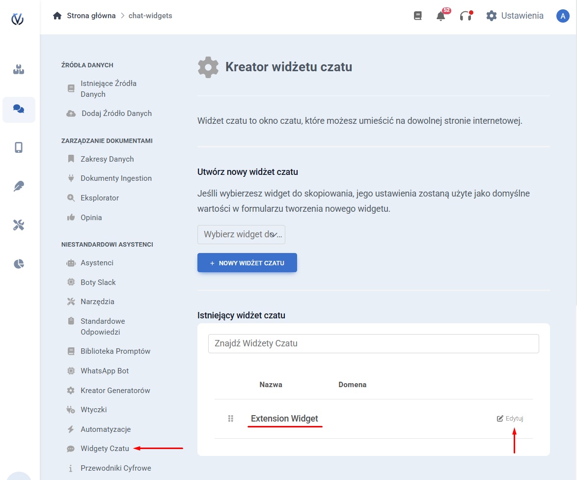Wejdź w ustawienia Widgety Czatu i wybierz edycję Extension Widget.