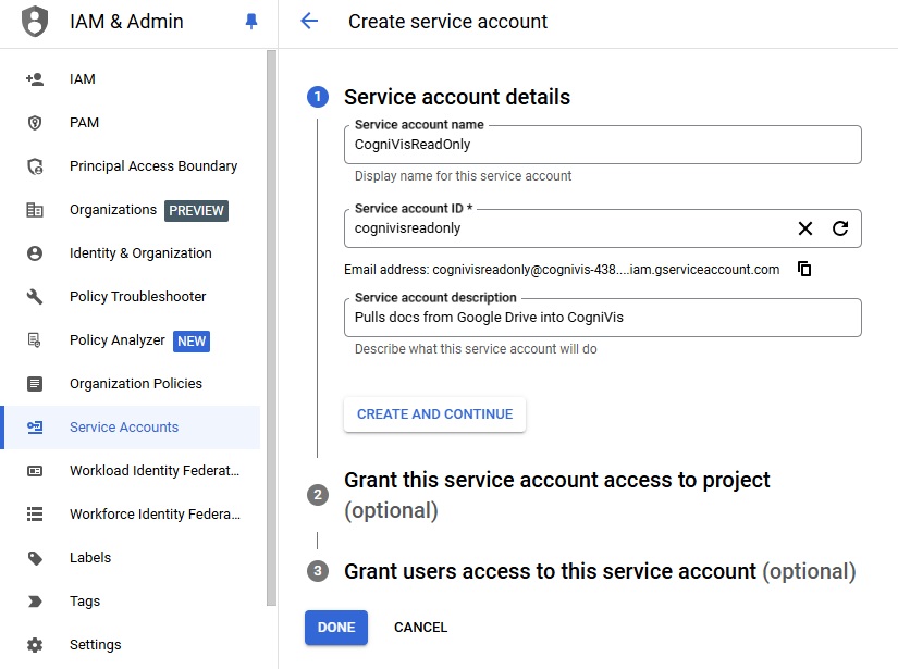 Go to the newly created service account, in the KEYS tab, press Add Key, select Create new key, download the file, and keep it ready for uploading to CogniVis later.