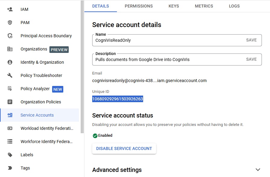 Copy the Service Account's Unique ID.
