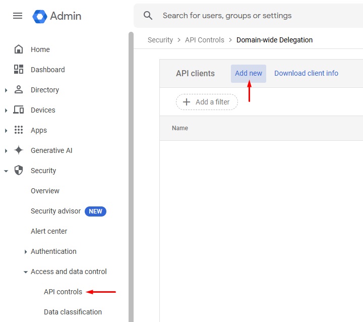 Navigate to the Domain-wide Delegation page in the Google Admin Console and select Add new.