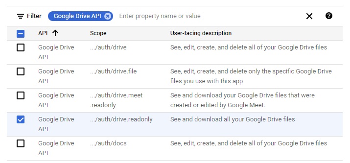 Include the scope .../auth/drive.readonly for the Google Drive API. Click UPDATE and then SAVE AND CONTINUE.