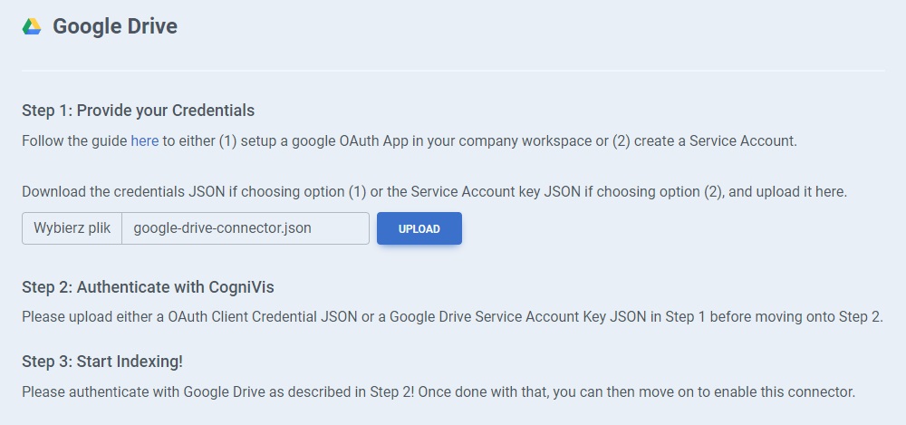 This account should preferably be the owner or admin of the Google Organization that manages the Google Drive(s) you want to index.