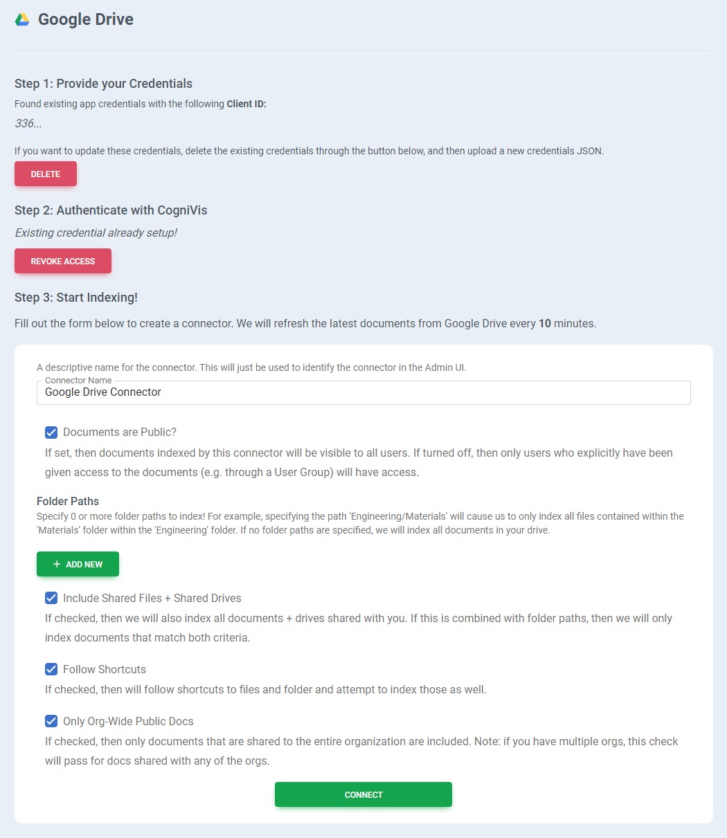 In CogniVis, go to Admin Panel, then in the sidebar choose Add connector. You will find the Google Drive connector setup page there.