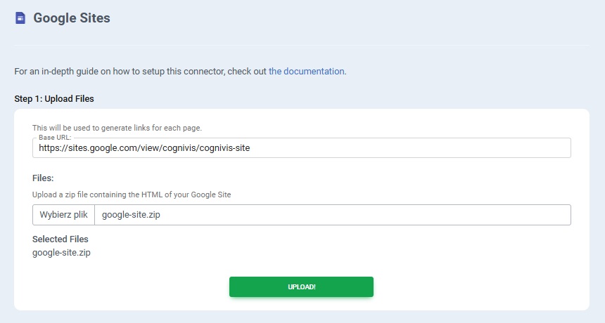 Provide the Base URL of your Google Site, which is the link to the site's homepage. Upload the zip file you downloaded earlier then click UPLOAD button.