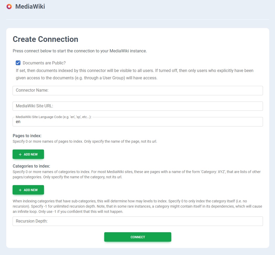 The MediaWiki Connector integrates with your MediaWiki-powered site, retrieving structured content for analysis, insights, and knowledge management.