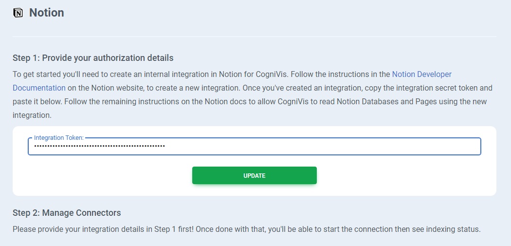 Please provide the Notion access token and click on the "Update" button.