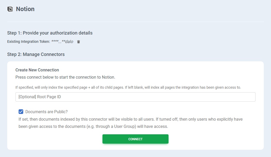 If you want to index all pages, press the "connect" button. If you wish to specify which page and its child pages should be indexed, enter it in the input field.