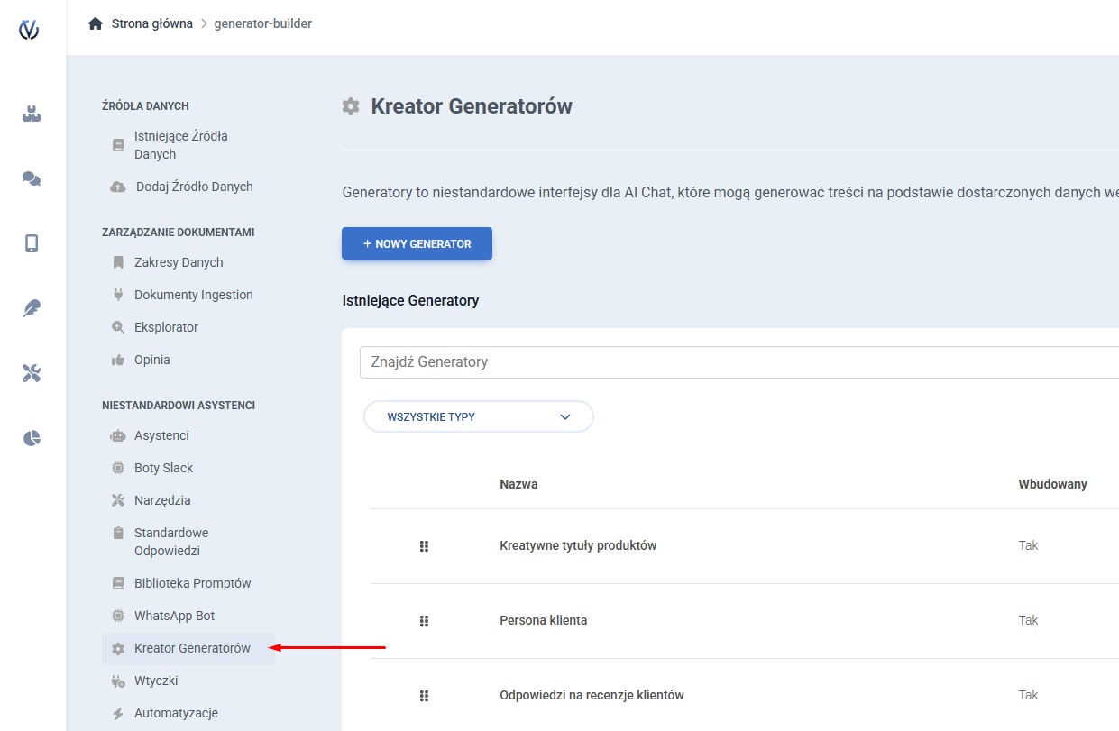 Puedes encontrar los generadores en el menú en la parte superior de la pantalla. Aquí puedes usar tanto generadores listos como tus propios generadores personalizados creados anteriormente.