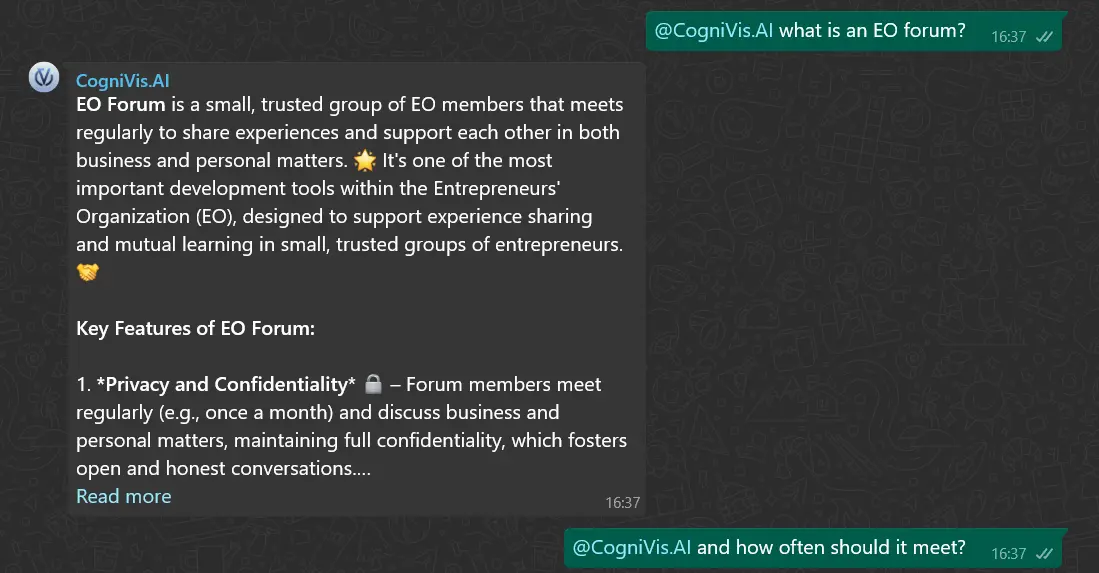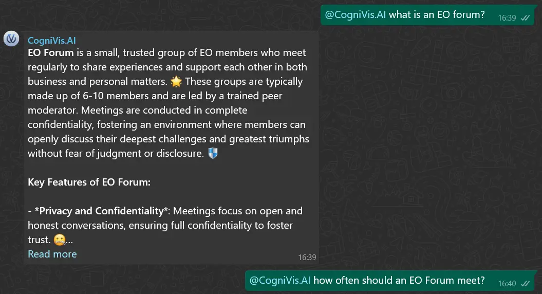 Due to privacy reasons, CogniVis.AI can't see any messages that were sent before you tagged the bot. This means that if you want to ask a question, you need to include the full context in the message in which you tag the bot.