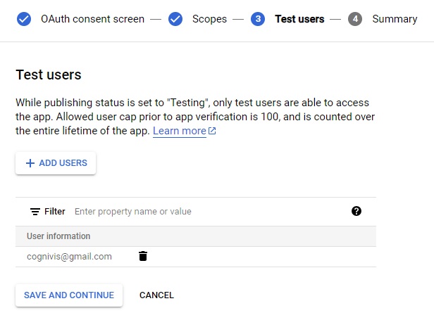 Provide at least one test user email. Only the email addresses added in this section will be able to initiate the OAuth flow for indexing new emails.