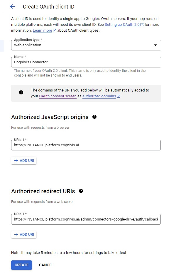 In Authorized redirect URIs, enter https://INSTANCE.platform.cognivis.ai/admin/connectors/google-drive/auth/callback
