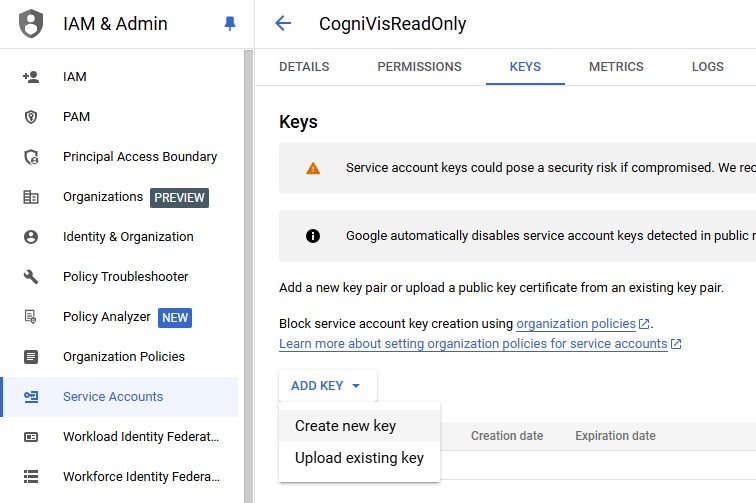Go to the newly created service account, in the KEYS tab, press Add Key, select Create new key, download the file, and keep it ready for uploading to CogniVis later.
