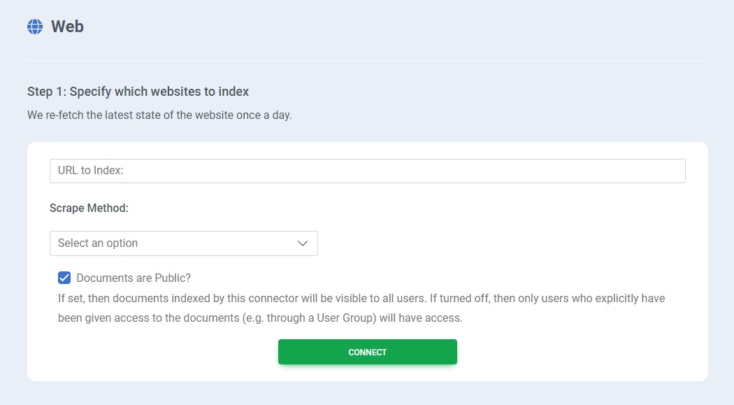 The Web Connector crawls and retrieves publicly accessible content from websites, offering insights and summaries based on available text and metadata.