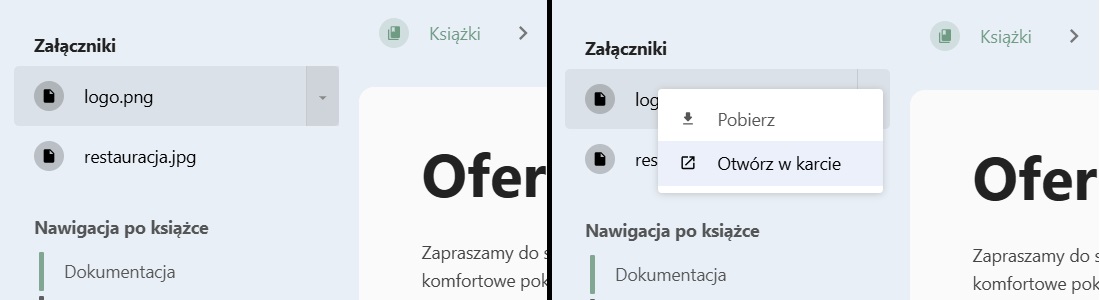 Po przesłaniu, załączniki będą widoczne w pasku bocznym podczas przeglądania strony. Można kliknąć załącznik, aby go otworzyć. Linki otwierają się w nowej karcie, natomiast pliki można pobrać lub obejrzeć w nowej karcie za pomocą menu rozwijanego po prawej stronie załącznika: