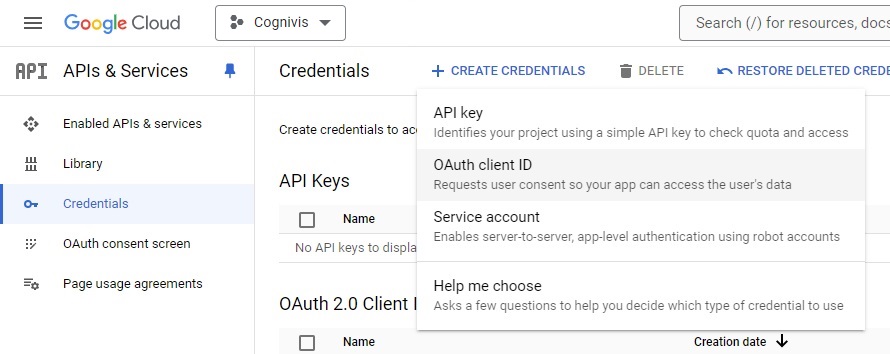 Navigate to the Credentials tab, press + CREATE CREDENTIALS and choose OAuth client ID.