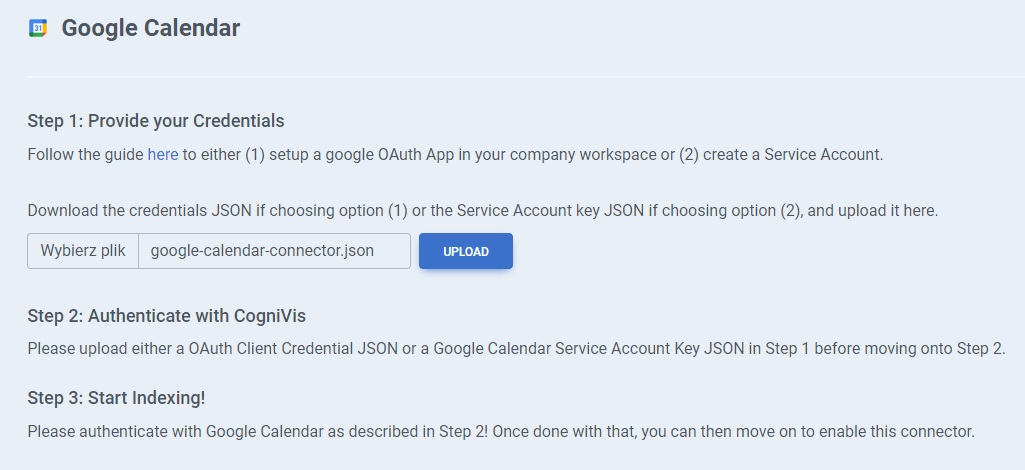 Press Authenticate with Google Calendar button. Finishing the OAuth flow will enable CogniVis to index emails the user has access to read. Remember that only email addresses added in Test users will be able to initiate the OAuth flow to index new emails.
