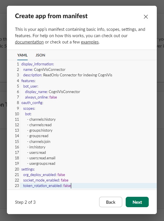 Give your connector a name (e.g., Slack Connector), provide the name of the workspace (you can find it by expanding the Slack menu). The rest of the options depend on your preferences.