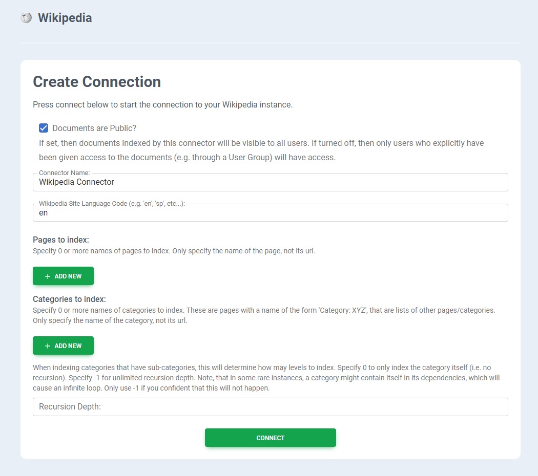 To index the selected page, give a name to the connector, specify the language code, and optionally provide the page name or category name.