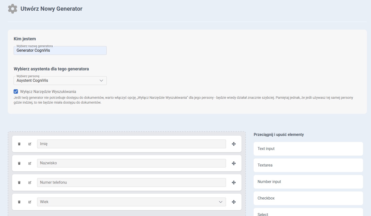 Oprócz gotowych opcji, możesz również tworzyć własne, niestandardowe generatory. Pozwala to projektować narzędzia dopasowane do Twoich unikalnych potrzeb w zakresie treści, czyniąc CogniVis elastycznym rozwiązaniem do każdego rodzaju tworzenia zawartości.